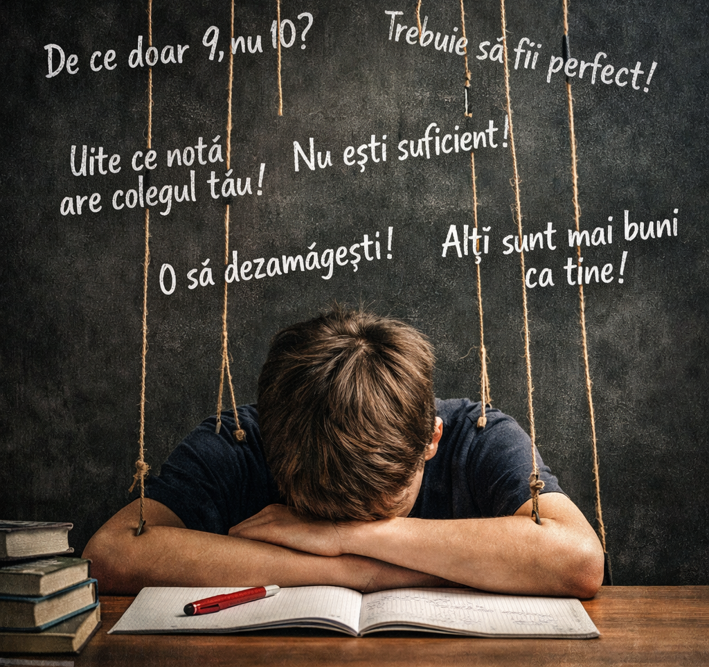 Replica aparent banală – „De ce ai luat 9 și nu 10?”, „Uite ce notă are colegul tău”, „Alții o să reușească mai mult decât tine” – sapă adânc. Copilul începe să simtă că nu este suficient, nu pentru ceea ce este, ci pentru ceea ce produce.